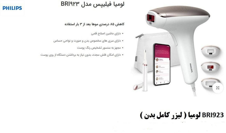 لومیا BRI923 «فیلیپس» (Philips) • IPL مخفف کلمات Intense Pulsed Light به معنای نور پالسی شدید می باشد. لومیا فیلیپس مدل BRI923 با اعمال پالس های ملایم به ریشه مو، فولیکول آن را به فاز استراحت می برد. در نتیجه موهای بدن به تدریج کاهش می یابند. تکرار این پروسه پوست شما را به طور زیبایی عاری از مو و لطیف می سازد. مراقبت های بعدی برای جلوگیری از رویش مجدد موها، حتی در نقاط حساس بدن نیز بسیار امن و راحت می باشند. لومیای فیلیپس با همکاری و مشورت متخصصین پوست طراحی گردیده و تست شده است. • مطالعات نشان دهنده کاهش 85 درصدی موها بعد از 3 بار استفاده می باشد.** 4 استفاده اول باید با فواصل 2 هفته ای انجام گیرند. بعد از این مدت شما بایستی قادر باشید تا نتیجه دلخواه خود را مشاهده نمایید. برای ادامه نتیجه گیری فرآیند را هر 4 هفته یک بار تکرار نمایید. بعد از 8 بار استفاده حداقل برای 3 ماه رشد مویی را مشاهده نخواهید کرد.* • پوست و موهای مناسب برای این روش: Philips Lumea روی موها به رنگ طبیعی، بلوند تیره، قهوه ای و مشکی و بر روی پوست بسیار سفید تا قهوه ای تیره موثر می باشد. مانند سایر روش های مبتنی بر نور، Philips Lumea روی موهای جو گندمی، بلوند روشن و قرمز و همچنین برای پوست های تیره موثر نمی باشد. دلیل این موضوع این است که بایستی بین رنگ دانه های مو و رنگ دانه های پوست تفاوت رنگ زیادی وجود داشته باشد. • برای ایمنی بیشتر کاربر، دستگاه مجهز به سنسور تشخیص رنگ پوست می باشد. این سنسور در ابتدای هر استفاده و به صورت تصادفی در طول استفاده میزان تیرگی رنگ پوست را اندازه گیری کرده و در صورتی که رنگ پوست برای دستگاه تیره باشد مانع از ادامه کار خواهد شد. • دستگاه Philips Lumea برای از بین بردن موهای زائد صورت (بالای لب، چانه و خط ریش) و بدن (پاها، زیربغل، نواحی بیکینی، شکم و بازوها) مناسب می باشد. • سری مخصوص بدن با دهانه بزرگ برای بالا بردن سرعت استفاده در نواحی وسیع مانند پاها ( مساحت 4 سانتی متر مربع). • سری مخصوص صورت با فیلتر اضافی (مساحت 2 سانتی متر مربع). • سری نقاط حساس مناسب برای نواحی زیر بغل و بیکینی (مساحت 3 سانتی متر مربع). • برنامه رایگان Lumea برای استفاده بهینه از دستگاه و ارائه راهنمایی های لازم در طول استفاده قابل دانلود می باشد. • به همراه ماشین اصلاح قلمی. • دارای امکان فلش زدن مجدد بدون نیاز به برداشتن دستگاه از روی پوست. • قابلیت استفاده فقط با سیم. • زمان بندی مورد نیاز برای انجام IPL روی قسمت های مختلف بدن: نواحی بیکینی 4 دقیقه زیربغل 2.5 دقیقه صورت 2 دقیقه ساق پا 15 دقیقه • دارای فیلتر داخلی UV. • 5 درجه تنظیم شدت نور. • سنسور جلوگیری از پالس دهی ناخواسته. • دارای کیف مسافرتی. • 2 سال گارانتی. • ساخت کشور مجارستان. *متوسط 71 درصد کاهش مو روی پاها، بعد از 12 بار تکرار انجام شده روی 48 خانم در هلند و اتریش. **اندازه گیری شده روی پا، 67 درصد از 45 نفر خانم حداقل 85 درصد کاهش را مشاهده کردند.