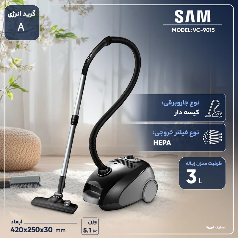 جاروبرقی کیسهدار سام مدل VC-9015، با فیلتر Hepa 13، وزن 5.13 کیلوگرم، دارای چهار عدد سری مجزا، لوله تلسکوپی، موتور با توان مکش 550 وات، میزان صدا 75 دسیبل، طول کابل برق 7 متر، گنجایش مخزن 3.5 لیتر