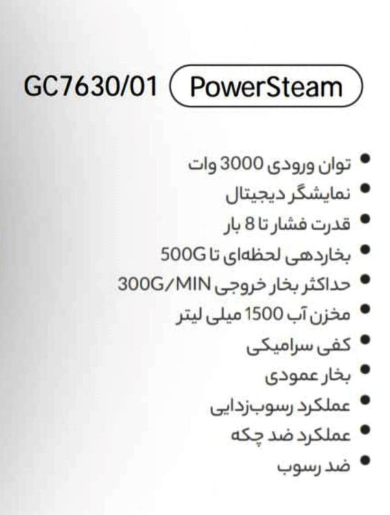 نمایشگر دیجیتال توان 3000 وات بخار مداوم 300 گرم بر دقیقه بخار لحظه ای تا 500 گرم جنس کفی سرامیک خاموش شدن خودکار دارد سیستم ضد چکه دارد بخار عمودی دارد رسوب زدایی دارد مخزن رسوب ندارد رسوب زدایی مضاعف ندارد اسپری آب دارد تنظیم دما دستی تنظیم بخار دارد طول سیم 2.5 متر حجم مخزن آب 1500 میلی لیتر وزن 1.5 کیلوگرم مدت گارانتی 2 سال سایر ویژگی ها سیستم ایمنی جلوگیری از داغ شدن بیش از حد کفی اتو