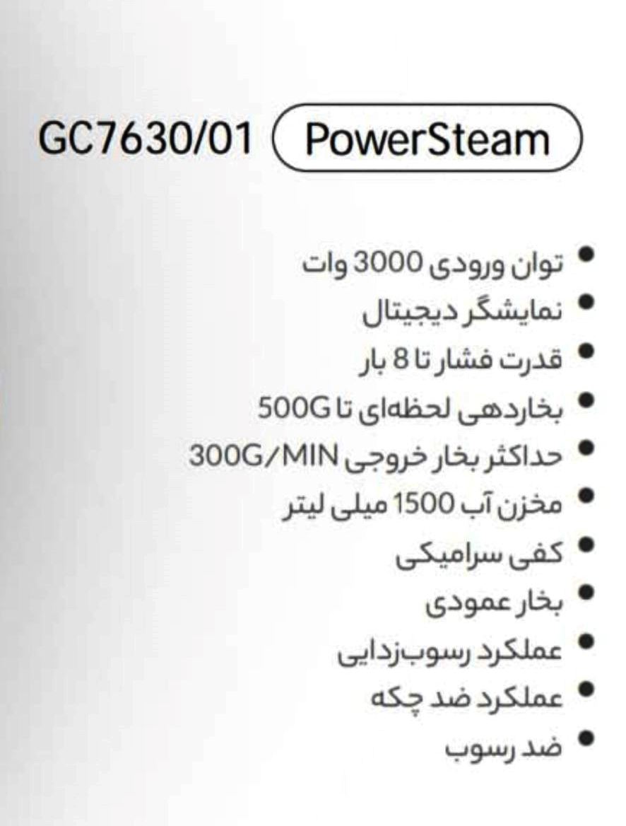نمایشگر دیجیتال توان 3000 وات بخار مداوم 300 گرم بر دقیقه بخار لحظه ای تا 500 گرم جنس کفی سرامیک خاموش شدن خودکار دارد سیستم ضد چکه دارد بخار عمودی دارد رسوب زدایی دارد مخزن رسوب ندارد رسوب زدایی مضاعف ندارد اسپری آب دارد تنظیم دما دستی تنظیم بخار دارد طول سیم 2.5 متر حجم مخزن آب 1500 میلی لیتر وزن 1.5 کیلوگرم مدت گارانتی 2 سال سایر ویژگی ها سیستم ایمنی جلوگیری از داغ شدن بیش از حد کفی اتو