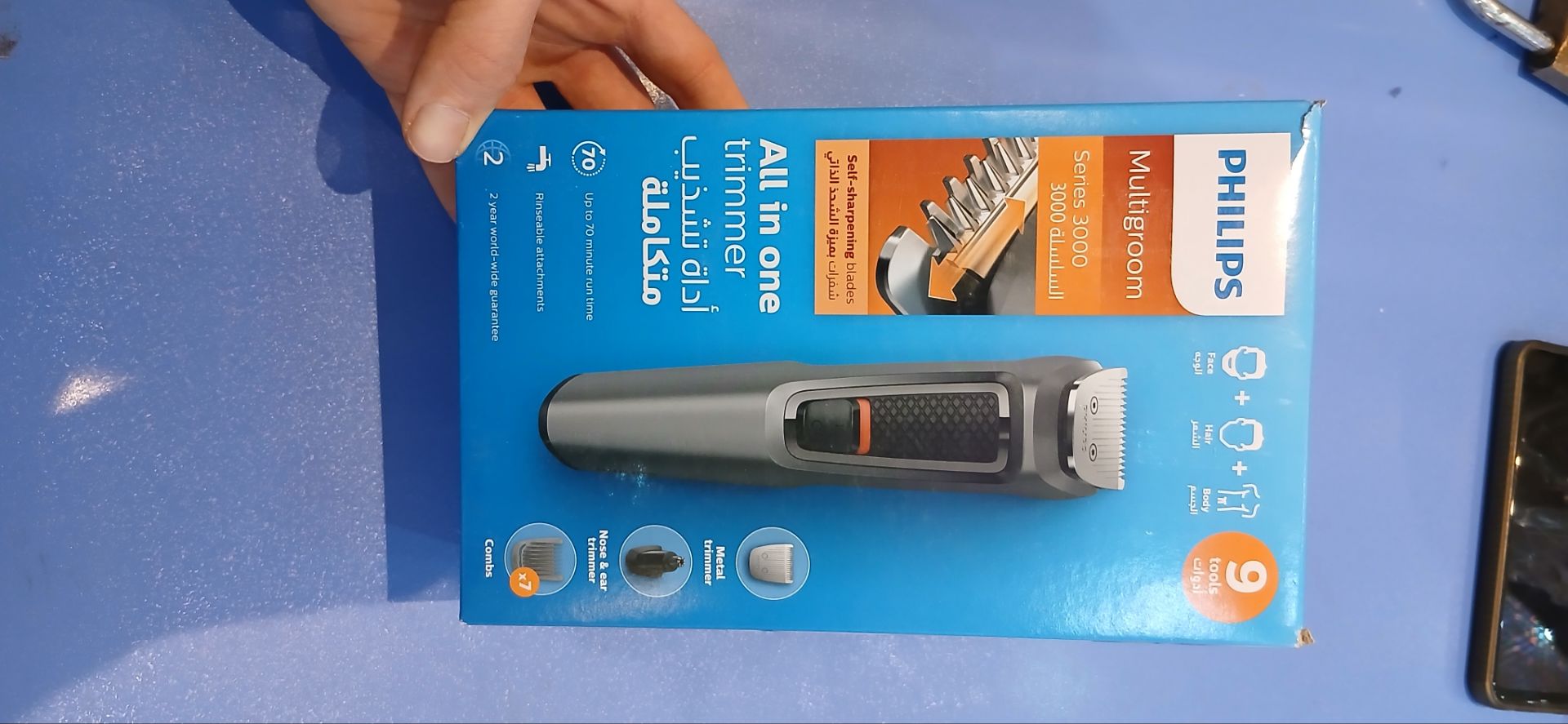 مجموعه لوازم اصلاح MG3747 «فیلیپس» (Philips) اصلاحی بدون نقص با استفاده از تیغه های خودتیزشونده که با لغزش روی یکدیگر باعث می شوند که حتی پس از 3 سال استفاده تیغه ها به همان تیزی روز اول باشند. 9 ابزار، مناسب اصلاح و فرم دهی به موهای صورت، کوتاه کردن موی سر و اصلاح بدن. سری اصلاح با تیغه های خود تیز شونده. دارای موزن گوش و بینی. دو عدد شانه ته ریش (1 و 2 میلی متر)، یک عدد شانه قابل تنظیم ریش (7-3 میلی متر)، سه عدد شانه اصلاح موی سر (16، 12، 9 میلی متر) و یک عدد شانه بدن (3 میلی متر). 16 ساعت شارژ برای 70 دقیقه استفاده به وسیله باتری Ni-MH. تیغه ها و شانه های قابل شستشو ( بدنه دستگاه قابل شستشو نمی باشد). دارای کیف نگهداری. بدون نیاز به روغن کاری. ولتاژ: 100 الی 240 ولت. دو سال گارانتی. ساخت کشور اندونزی.